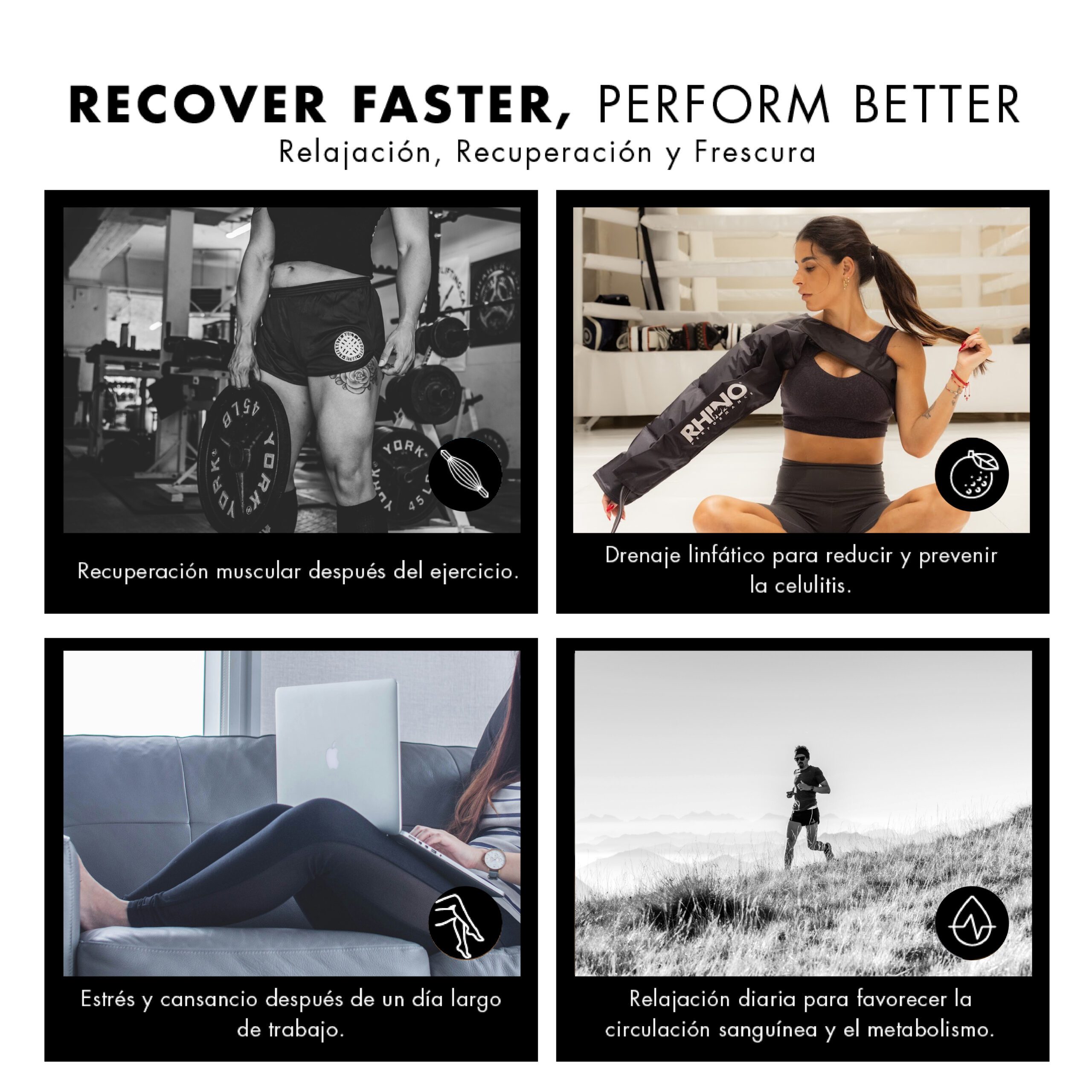 Los brazos de compresión RHINO PERFORMANCE aceleran la recuperación muscular reduciendo la fatiga. Aumentando la circulación de flujo sanguíneo, estimulando el drenaje del sistema linfático y eliminando del cuerpo los desechos metabólicos.